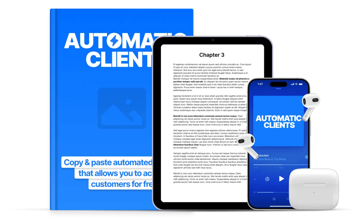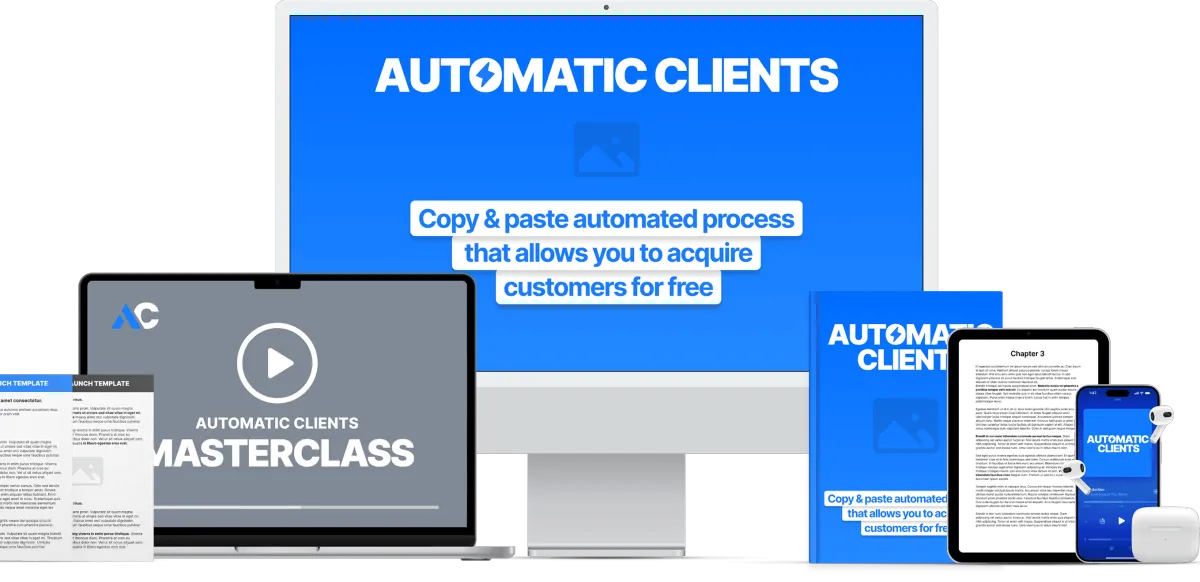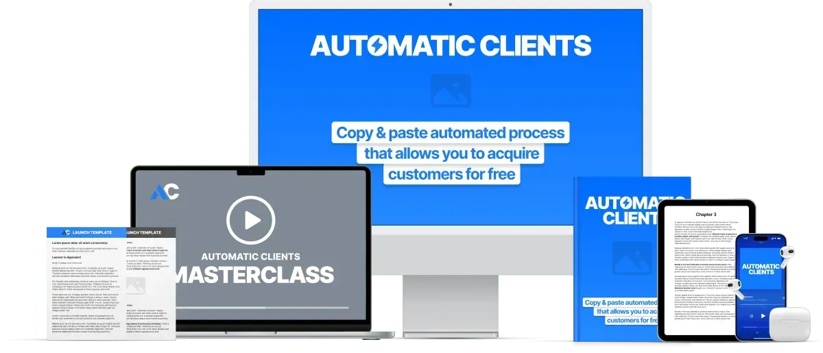 [INSERT ANSWER] You are getting a copy of the Automatic Clients eBook, available instantly. You are getting the highly praised 6+ hour Advanced Acquisition Theory course. You are getting our advanced Economics Calculator. You are getting our 2,854 Profitable Niches spreadsheet. You’re getting the 7-Day Fast Start video series, our best $200,000 Advertisement, access to our FB community, our 7-Figure Video Sales Letter script, and a 26-step Launch Checklist.